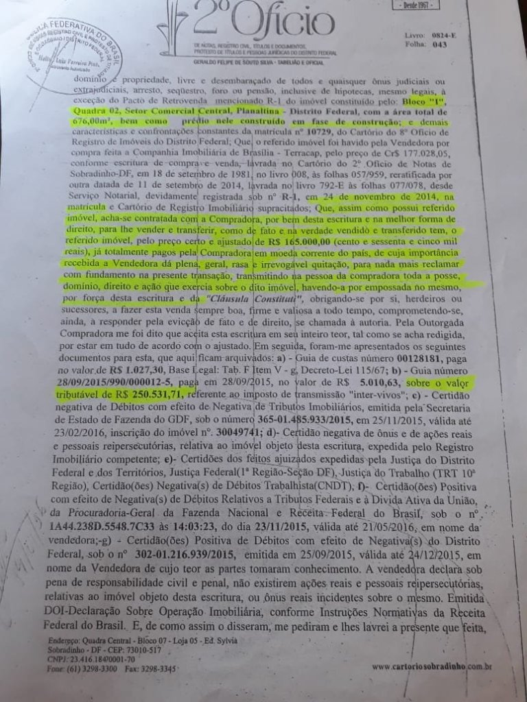 Mesmo com a ilegalidade, o cartório de Sobradinho, por boa fé, registrou a ata que liberava a transação, consequentemente a negociação da venda do terreno foi concluída, inclusive entregue o documento de escritura de compra e venda, conforme foto abaixo.